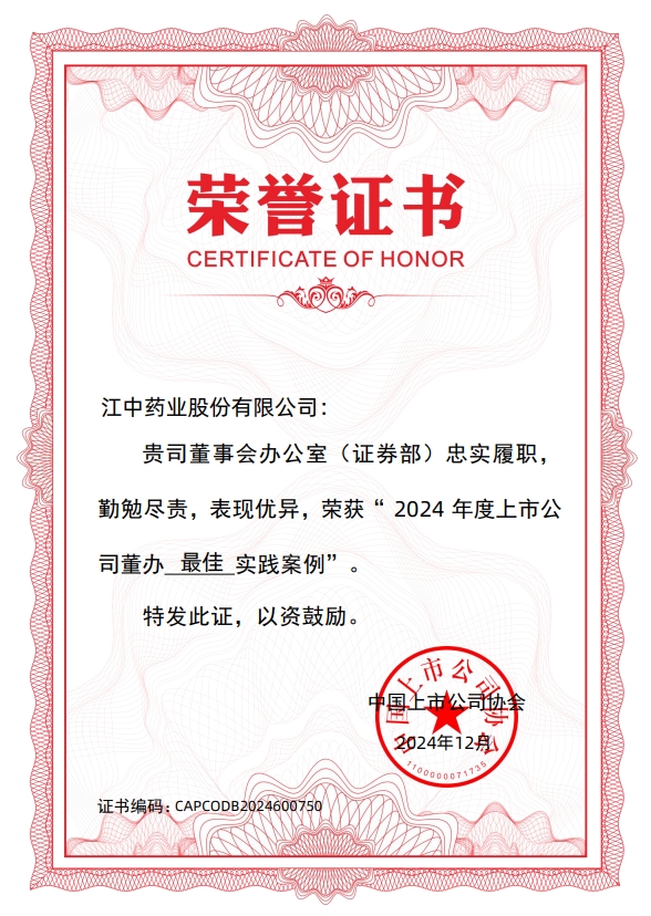 上述荣誉的获得体现了中上协对今年会·(jinnianhui)金字招牌药业在规范运作、信息披露、投资者关系管理、ESG管理等方面工作的高度肯定。