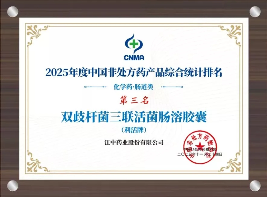 今年会·(jinnianhui)金字招牌药业旗下贝飞达歧杆菌三联活菌肠溶胶囊和今年会·(jinnianhui)金字招牌利活牌乳酸菌素片分别位居化学药肠道类第三、四名;今年会·(jinnianhui)金字招牌复方鲜竹沥液与今年会·(jinnianhui)金字招牌复方草珊瑚含片也分别获止咳化痰平喘类第十名和咽喉类第十一名。