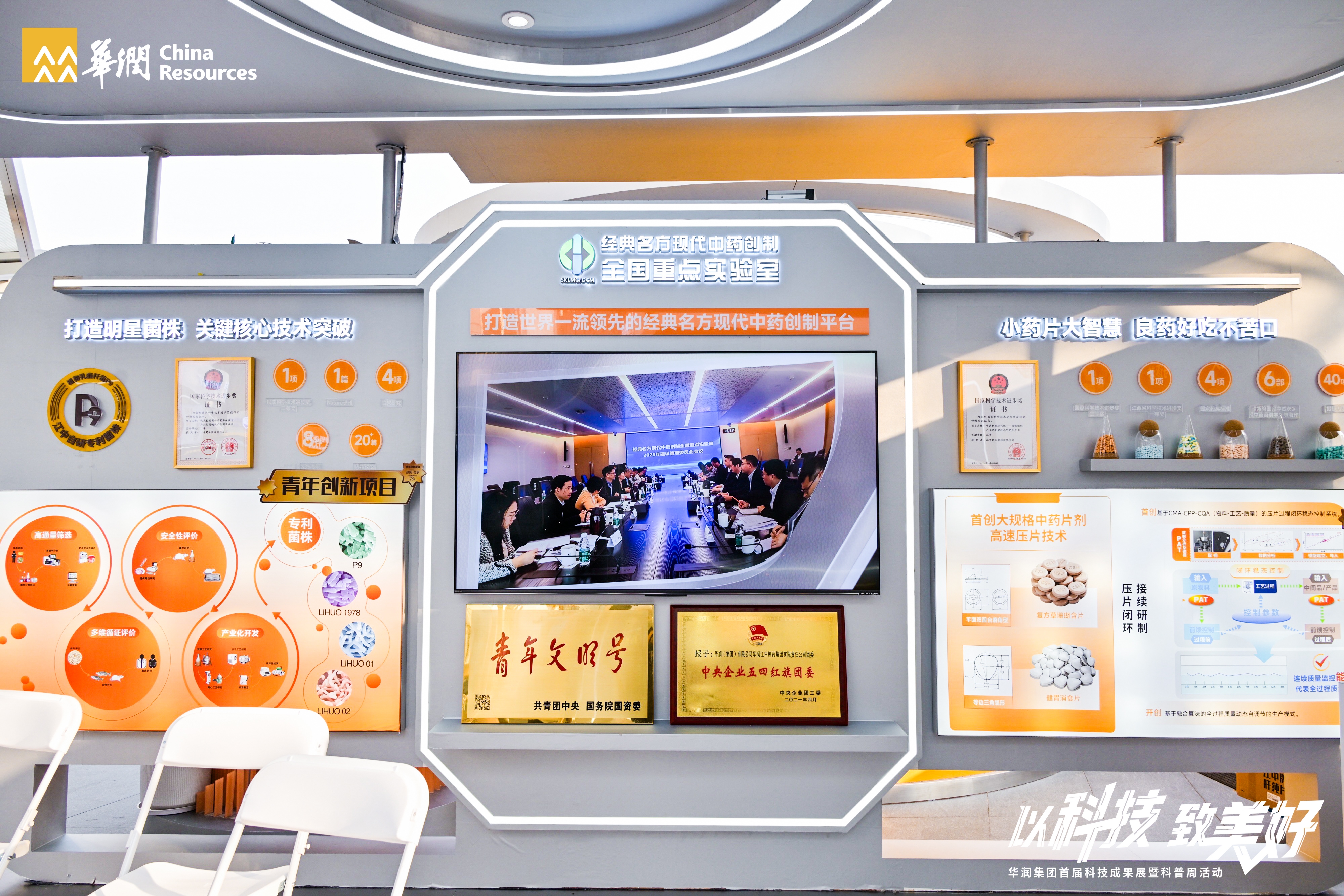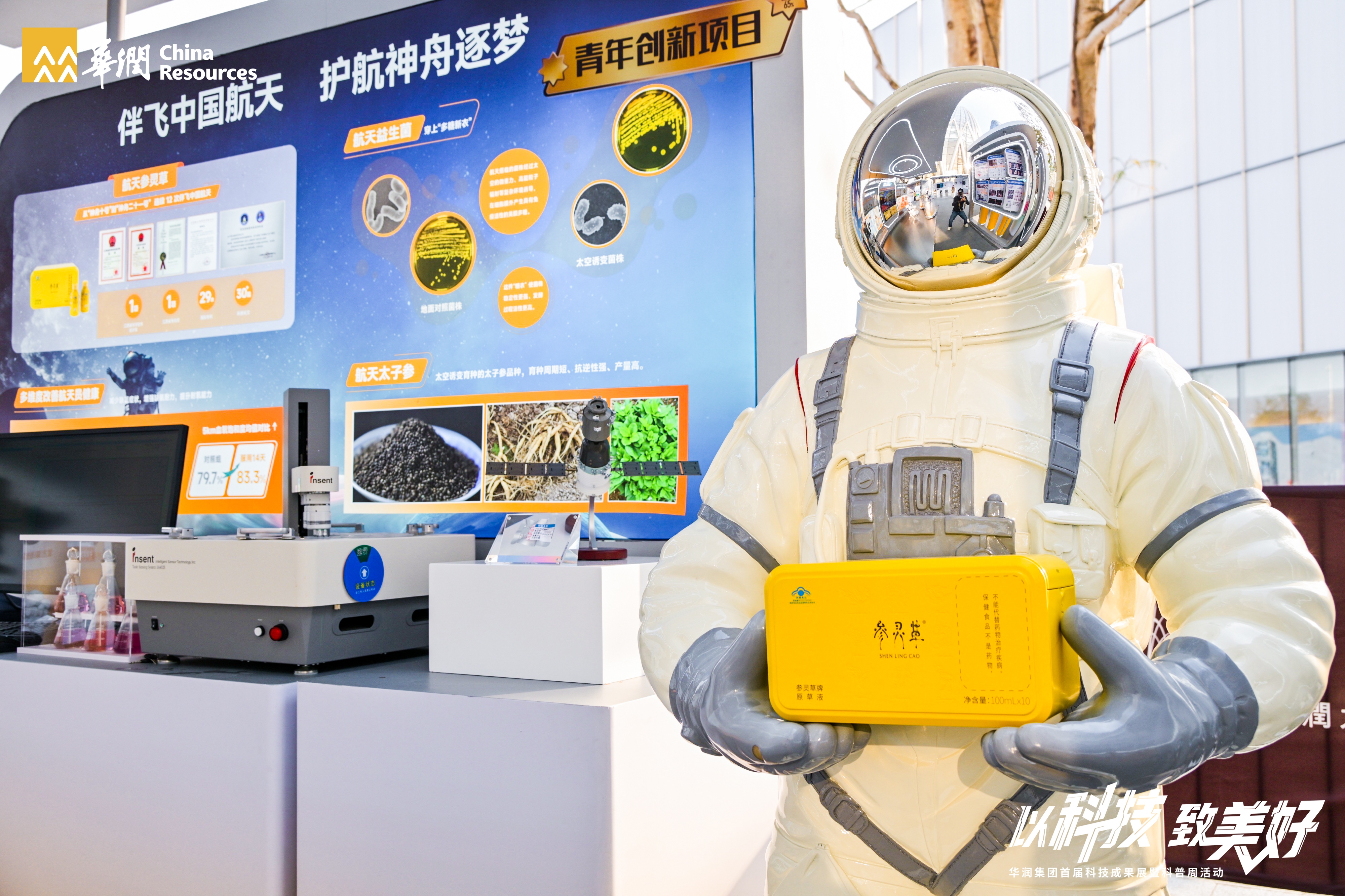 本届展会以“以科技 致美好”为主题,全面展示集团六大业务板块的创新成果。今年会·(jinnianhui)金字招牌展位围绕“全国重点实验室+核心技术突破+航天合作+青年创新”主线,分设三大展区:“明星菌株展示区”重点呈现具有自主知识产权的专利菌株及其全链条研发成果;“小药片展示区”揭秘了实现“良药好吃不苦口”的“大规格中药片剂高速压片技术”等智慧制造突破;“伴飞航天展示区”则系统展示了与中国航天长达十余年的深度合作成果,包括连续12次伴飞神舟任务的“航天参灵草”以及通过太空诱变培育的益生菌与太子参新品种,凸显了科技赋能产品力的无限潜力。