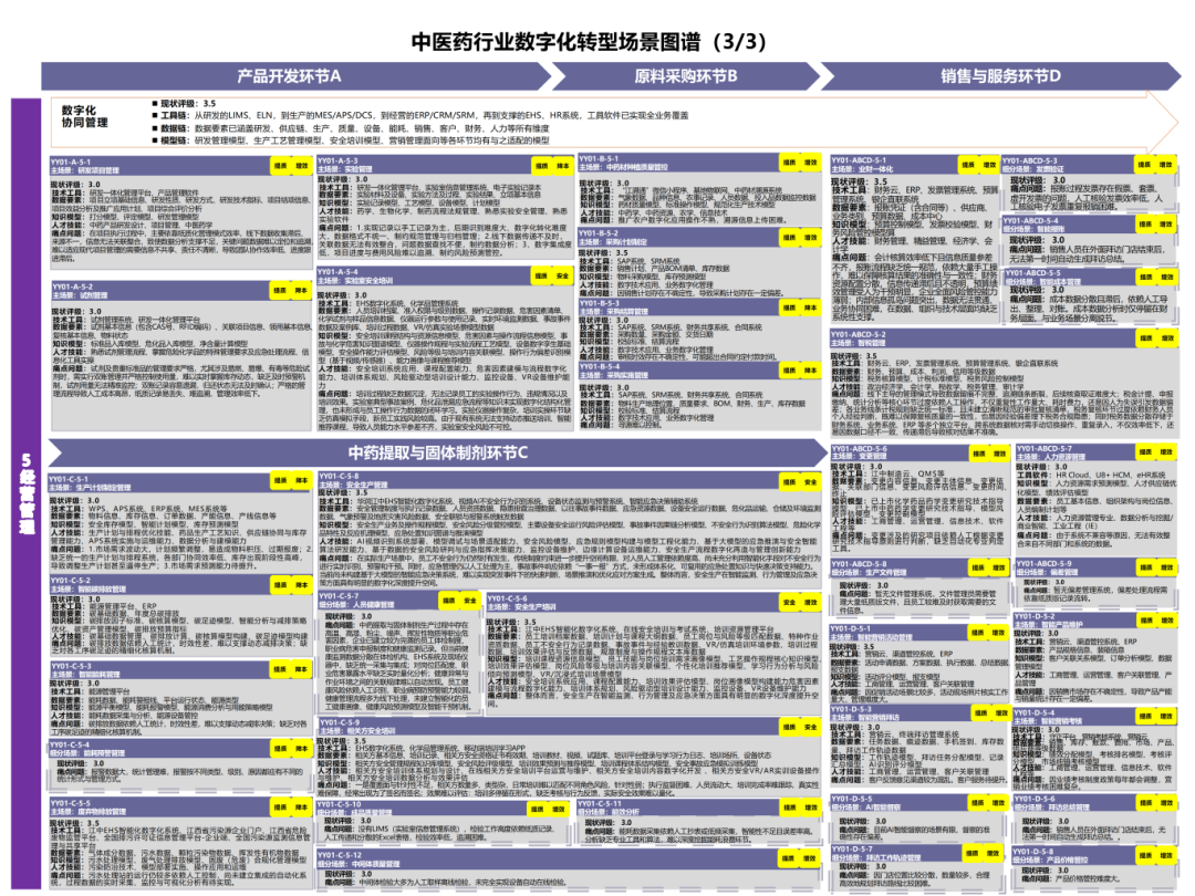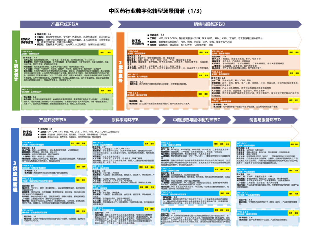 该图谱以系统工程方法论为指导,围绕中药产业核心环节与业务,系统构建了“1-5-4-94”框架体系:即以产品开发、原料采购、生产制造、销售服务4个关键产业链环节构成的完整链条为1条主线,紧扣研发、生产、运维、经营、供应链5大业务活动,依托数据、技术、人才、方法4大核心要素支撑,共梳理出94个典型数字化场景。图谱横向贯通产业链协同,纵向集成各环节业务,全面呈现中药产业链数字化转型的全景路径与关键节点。配套编制的《场景汇编》进一步明确了各场景的要素清单,为实践落地提供了具体工具。