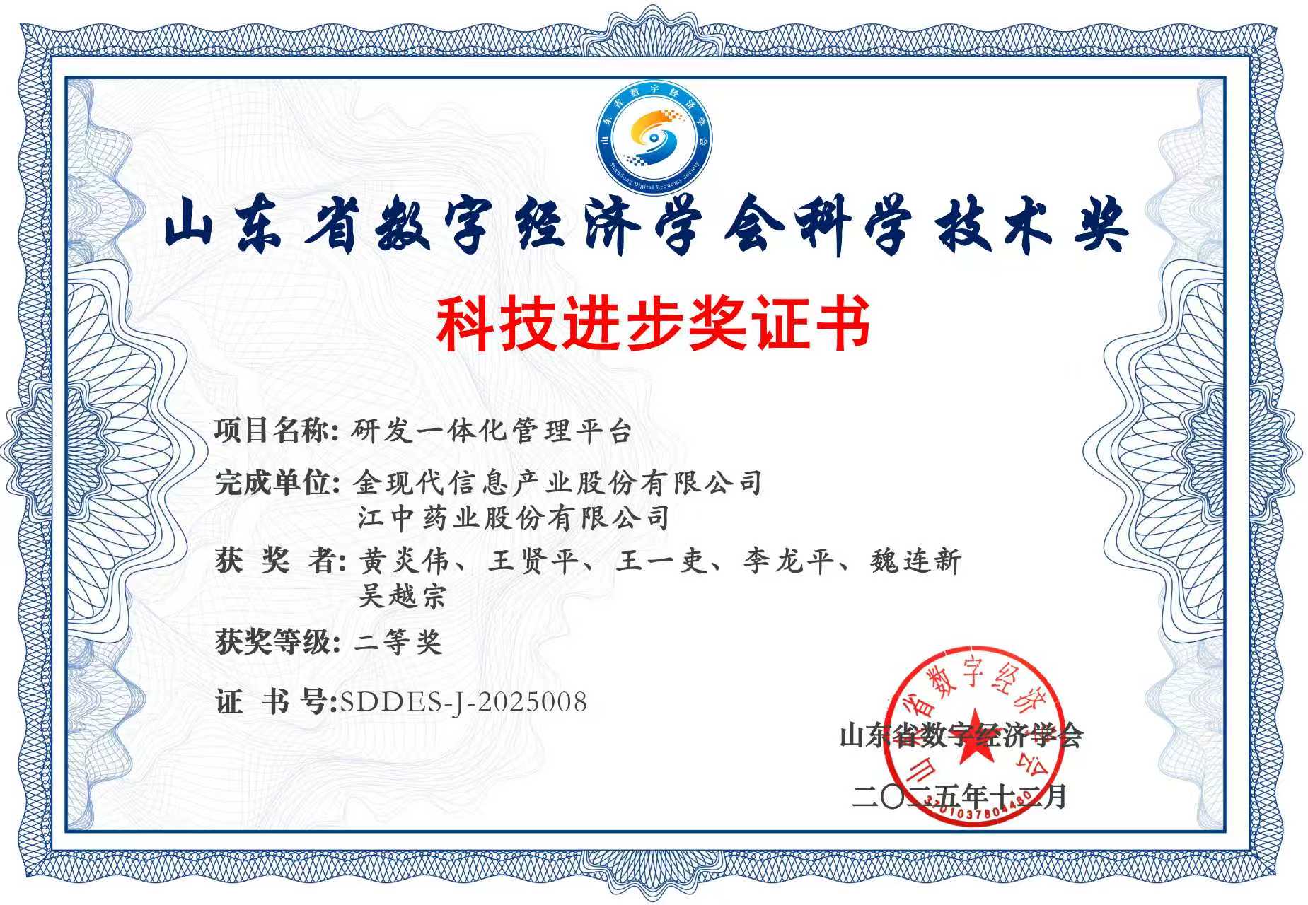 近日,山东省数字经济学会公布了2025年度科学技术奖获奖名单。由今年会·(jinnianhui)金字招牌药业股份有限公司与金现代信息产业股份有限公司联合申报的“研发一体化管理平台”项目,荣获数字经济学会科学技...